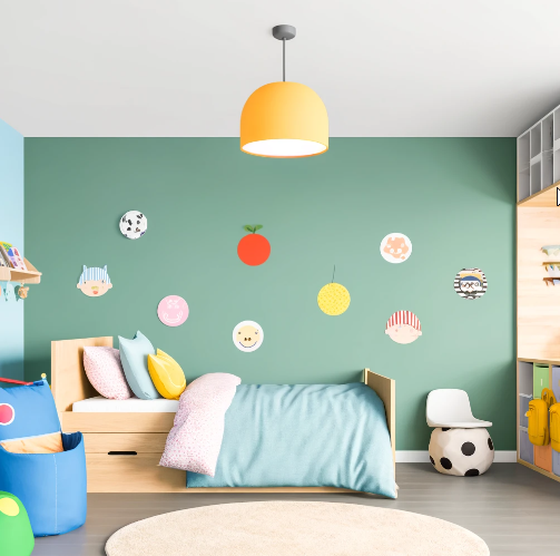 - الألوان الزاهية والمشرقة مثل الأصفر، البرتقالي، والأخضر تعتبر مثالية لخلق جو من الحيوية والنشاط داخل الغرفة. اللون الأصفر، على سبيل المثال، يُشعر الطفل بالبهجة ويحفز على التفاؤل، بينما يُعتبر اللون البرتقالي من الألوان الدافئة التي تعزز الحماس والتفاعل الاجتماعي. أما اللون الأخضر، فيعتبر مريحًا للنظر ويساعد على التركيز، وهو مثالي للمساحات المخصصة للأنشطة التعليمية.